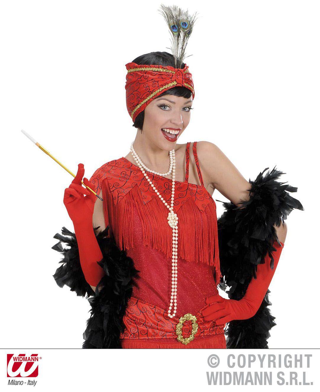 Das Model trägt zusätzlich Handschuhe, ein Stirnband, Schmuck, eine Strumpfhose und eine Zigarettenspitze.