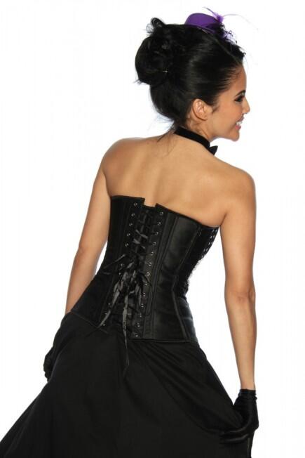Er hat einen eingearbeiteten Unterrock und einen breiten Satin Bund an der Hüfte.