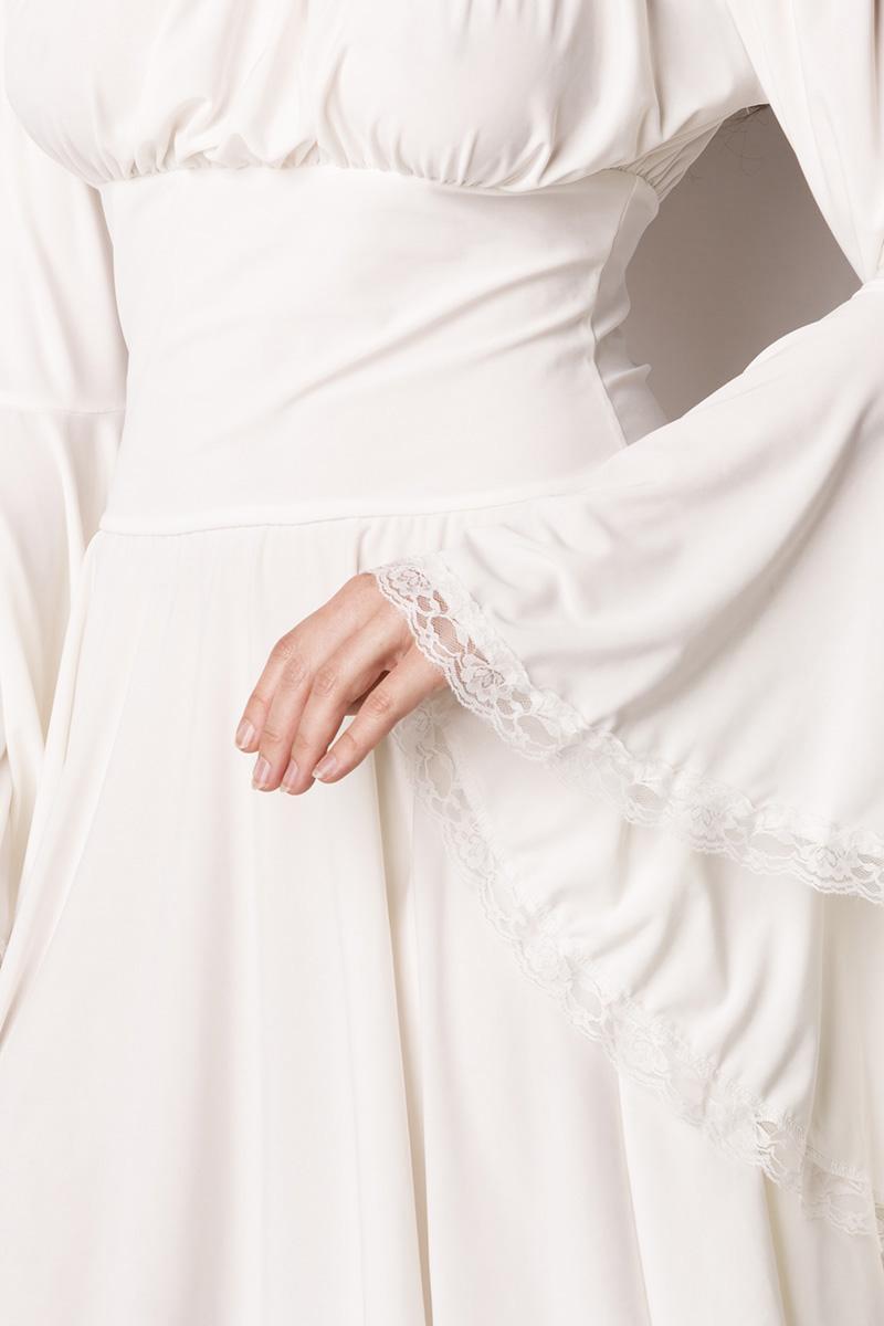 Auffallend sind die extrem weiten Trompetenärmel, welche mit Spitzenbesatz abschließen.