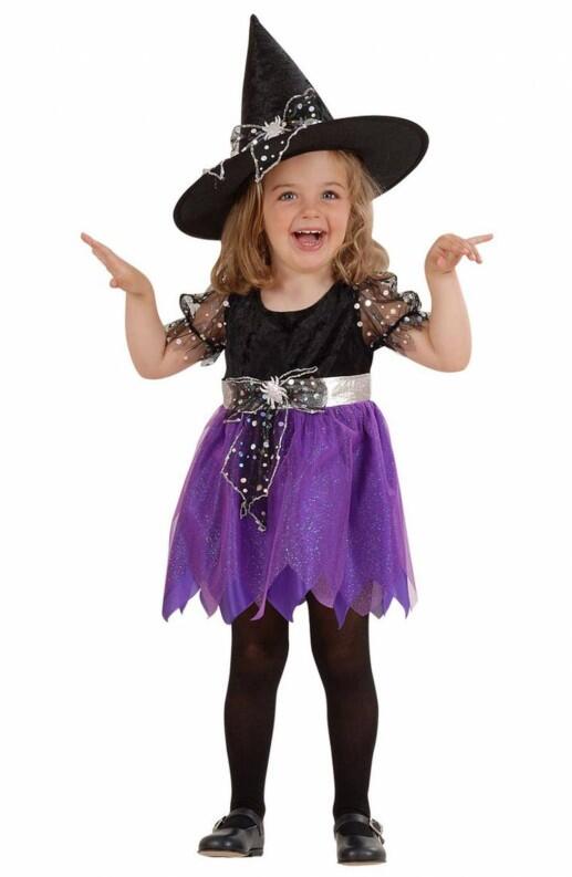 Das Mädchenkostüm besteht aus einem Kleid und einem passenden Hexenhut.