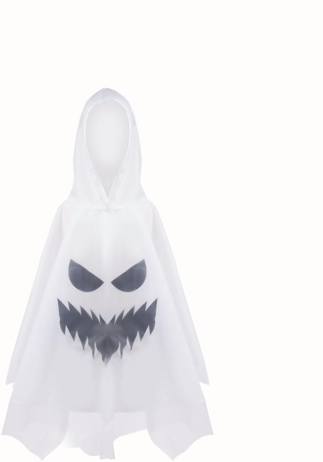 Ein weites, weißes Cape mit glitzerndem, schwarzen Geistgesicht und angeschnittener Kapuze.