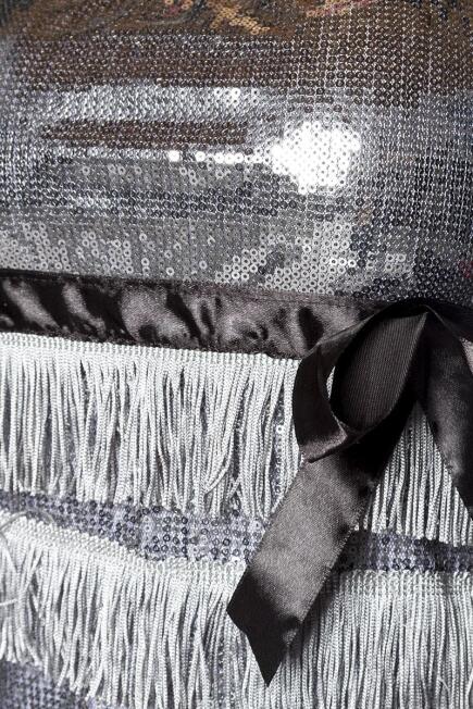 Es ist mit Pailletten und langen Fransen verschönt worden.