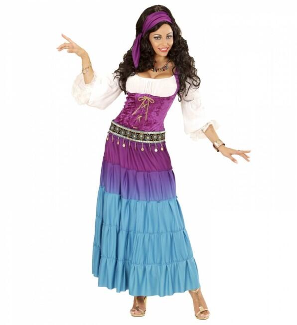 Das Damen Kostüm Zigeunerin Gypsy Princess ist ein überzeugendes Kostüm mit vielen glitzernden Goldakzenten, angenähtem Hüfttuch und passendem Kopftuch.