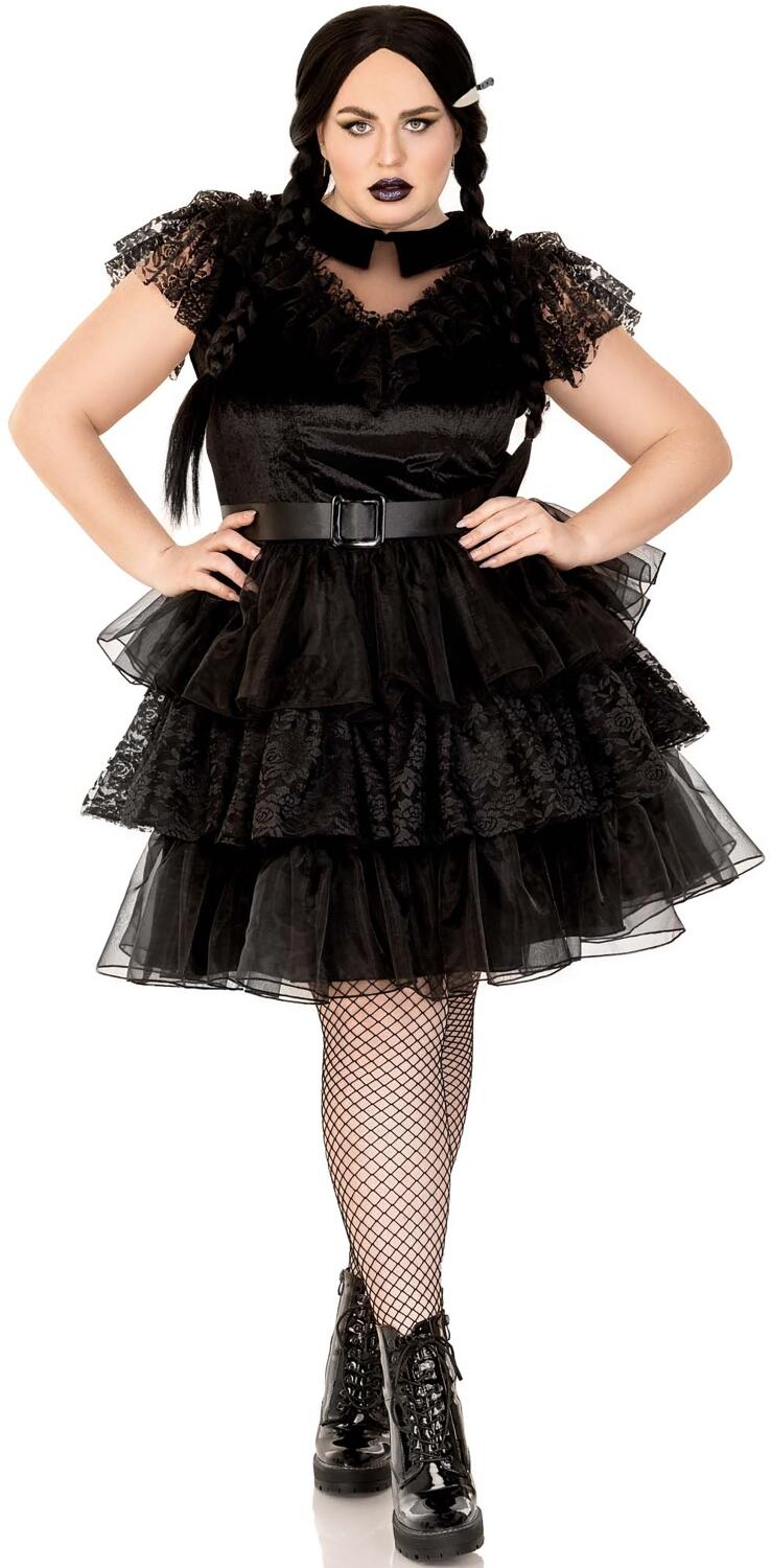 Das Model trägt zusätzlich eine schwarze Netzstrumpfhose, Boots und schwarzen Lippenstift.