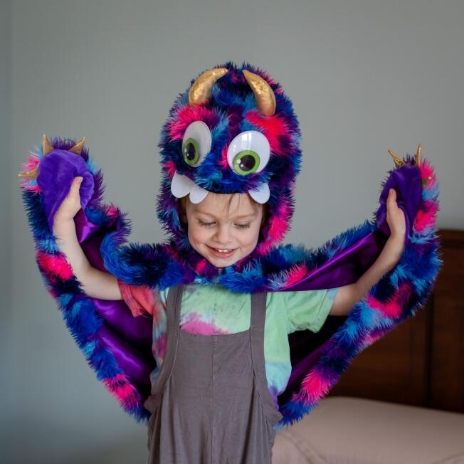Ein kuscheliger Umhang aus schwarzem Pannesamt mit angeschnittener, verstärkter Kapuze und orangefarbenem Futter.