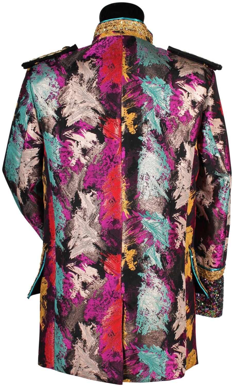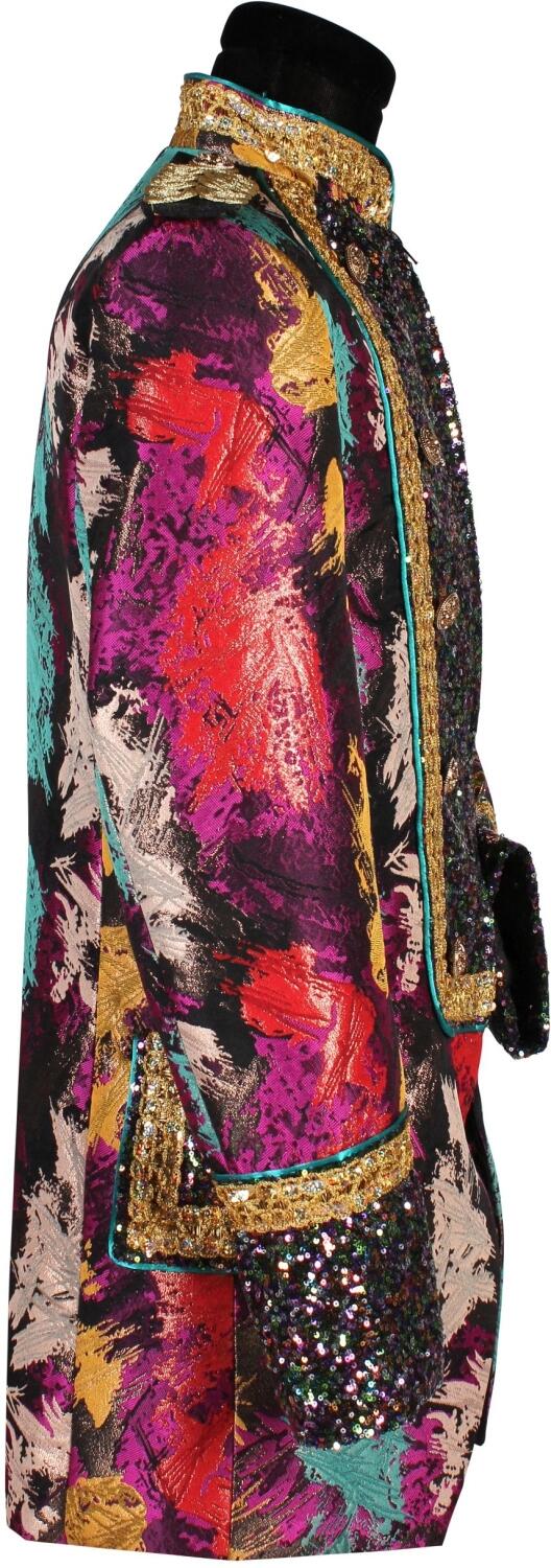 Manschetten, Taschen und vordere Einsätze sind aus bunten Pailletten gearbeitet.